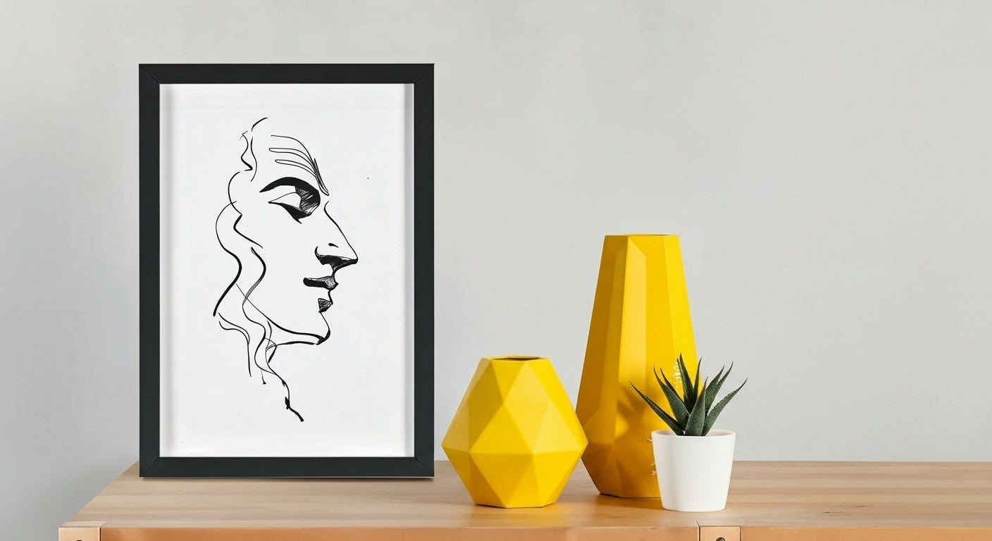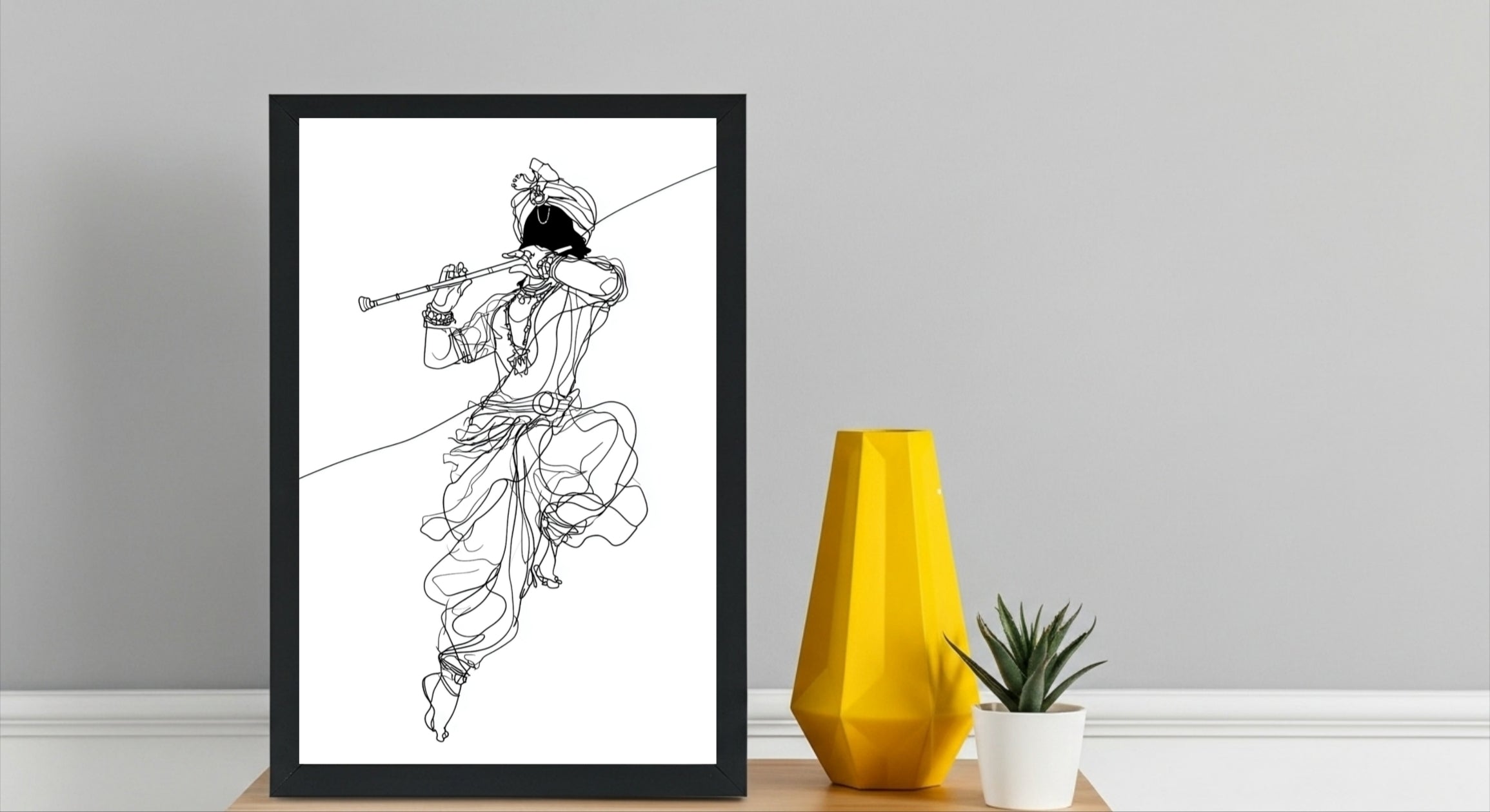 Minimalist Lord Krishna Line Art – Black Frame Wall Decor | Glossy Finish Spiritual Artwork
